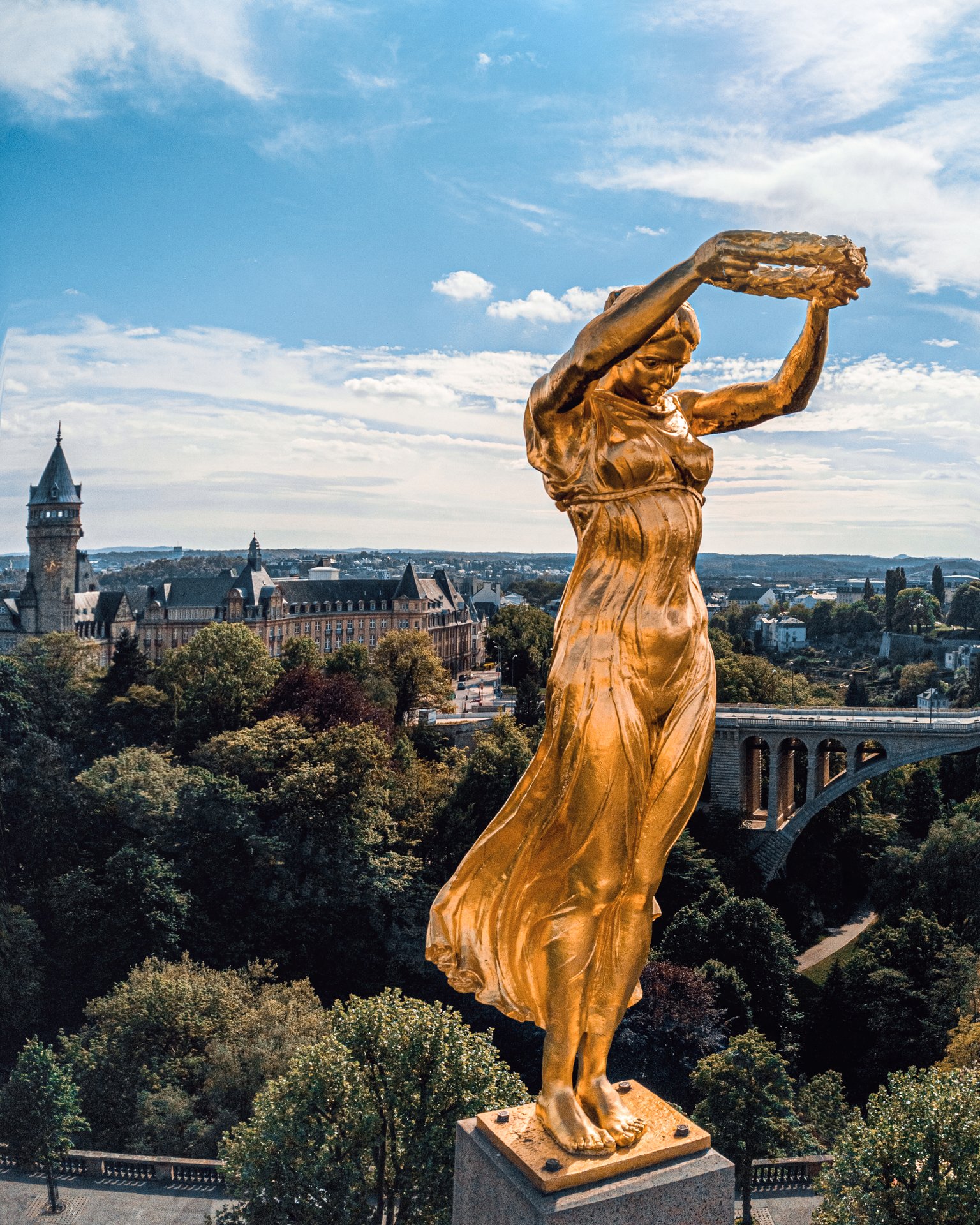 In December 1918, a committee was founded with the aim of erecting a national monument to remember the Luxembourg war heroes who fell in the French battlefields. The selected site was the “Place de la Constitution”, formerly known as Bastion Beck. On 14th February 1920, a competition was announced by the National Monuments Committee to create a monument in memory of the fallen soldiers. Cito’s project was chosen. It consisted of a 3-metre high “Gëlle Fra” standing on a 20 metre high obelisk, with two bronze statues at the base representing a dead soldier and his comrade. The sculpture was inaugurated on May 27, 1923. Nowadays, it symbolizes the freedom and independence of the country.